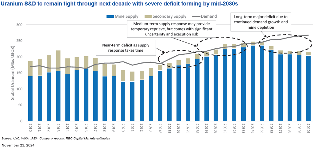 There is now a generally accepted consensus that the uranium market will be in deficit until the end of this decade, with a temporary surplus starting the early 2030s, if major projects like NexGen’s Arrow and Denison’s Phoenix come online on schedule. As RBC notes in the chart below, this expected supply comes with ‘significant uncertainty and execution risks’.