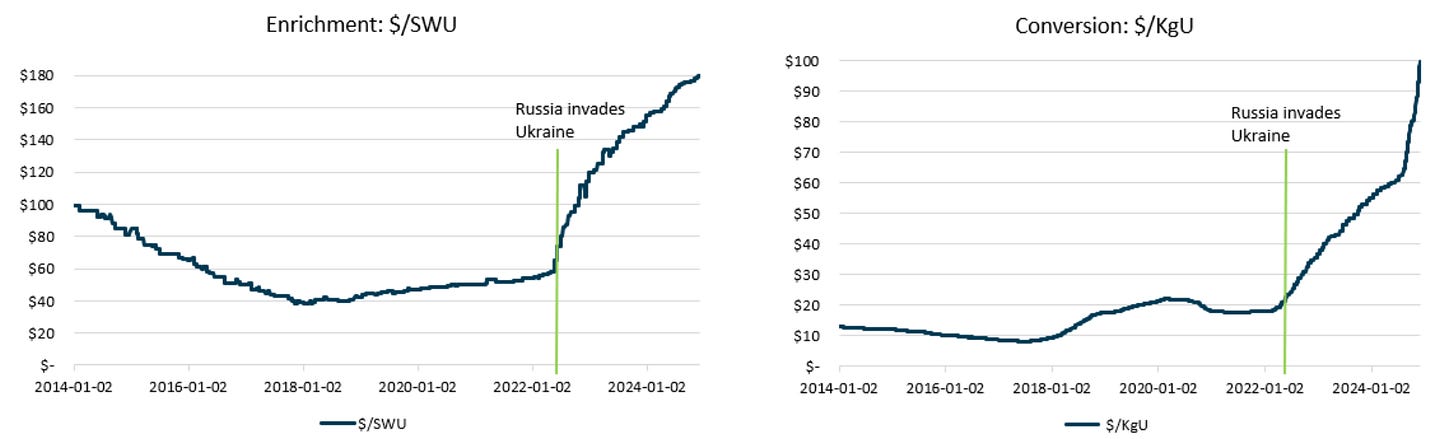 I also view the downside from current spot price levels ($76.50) to be limited. Term prices are at $81 / lb, and producers are negotiating ceilings as high as $150 / lb (e.g. NexGen). Due to pent-up demand, and diminishing spot market liquidity, the next wave of buying is likely to catalyze an outsized move to the upside, similar to the move towards the end of last year. We are already seeing this type of price action in conversion and enrichment, where prices are gapping up in response to panicked buying.
