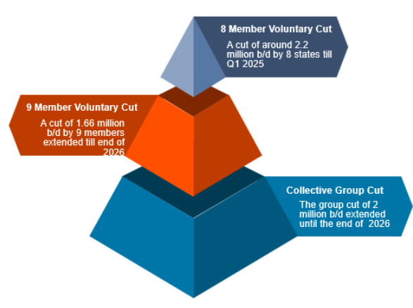 With oil prices hovering near $70, and marginal supply (US Shale) struggling to grow, I don’t see significant downside to dayrates from here absent an OPEC+ price war, or global economic collapse. With respect to the former, the risks have been significantly ameliorated with OPEC+’s recent decision to extend the 2.2mm b/d of voluntary cuts through Q1 2025, and the 2mm b/d ‘Collective Group’ cuts and 1.65mm b/d of prior voluntary cuts through 2026 (see diagram below illustrating the various layers of cuts and expiration dates).