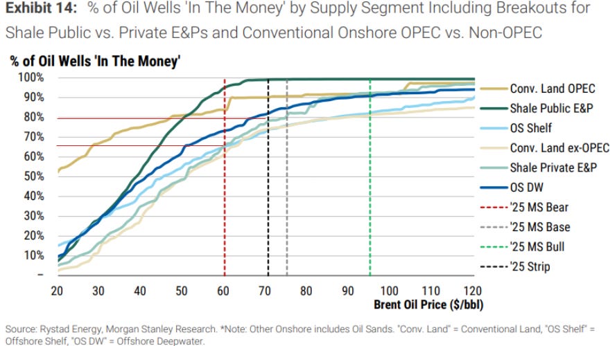 While US Shale has made significant efficiency gains, it’s becoming clear that drilling longer laterals and high-grading has its limits. ‘Per foot’ productivity is declining, and longer laterals are likely to produce less cumulative oil due to water encroachment and wellbore hydraulics that lower reservoir pressure and ultimate recovery. To increase production significantly from here, rig counts will have to go up in the Permian from the current ~300 level, for which higher oil prices are required. Morgan Stanley estimates that ~20% of private E&Ps, which represent roughly 1/3rd of total US oil production, are unprofitable at $70 oil.