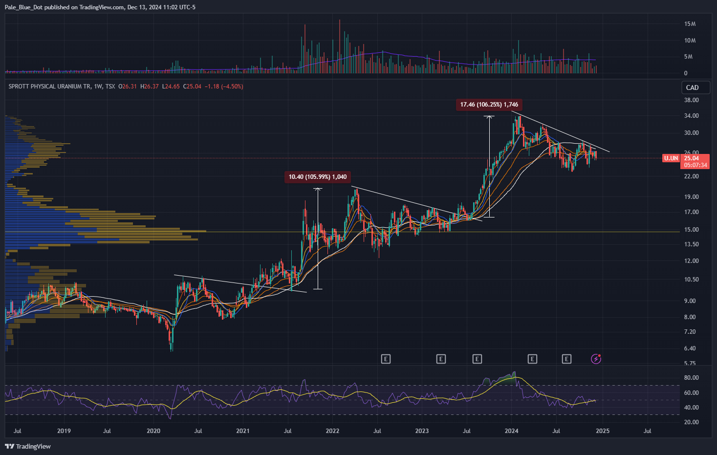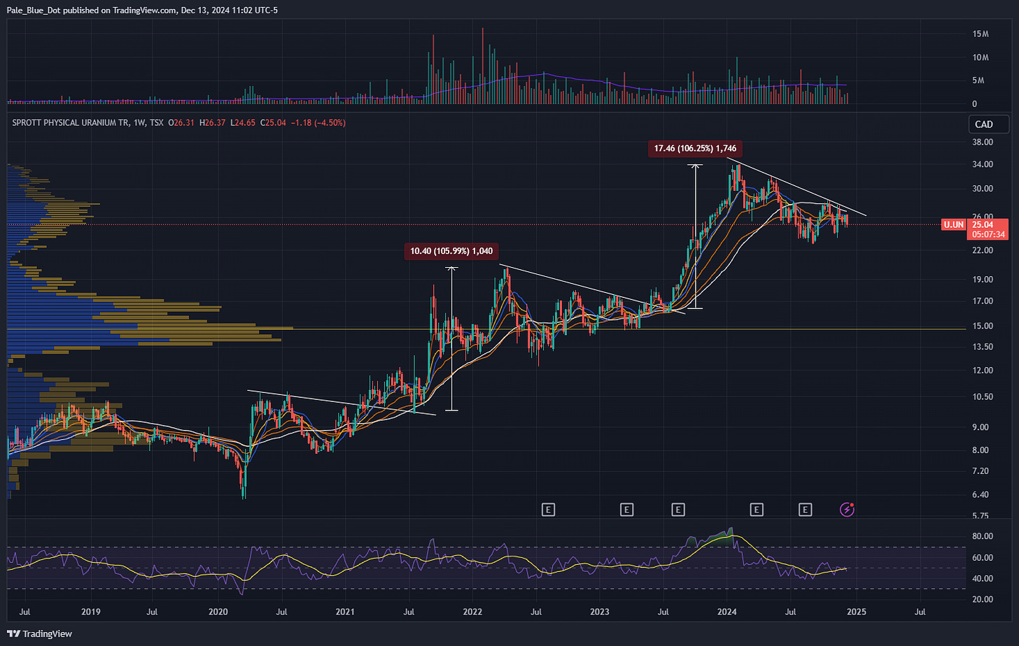 The difficulty is in timing these demand waves, because utilities hold their cards close to their chest in terms of procurement strategy, inventory management and future price outlook. The demand wave has been largely absent this year, with transaction volumes in both the spot and term markets significantly lower vs. last year. Uncertainty regarding Russian sanction waivers have contributed to the slowdown. In the meantime, price insensitive selling has been persistent from the usual sources, but also from some producer destocking and financial selling (ANU fund unwind). The price chart for SPUT below illustrates the periods of consolidation in 2020 - 2021 and 2022 - 2023 that preceded major rallies.