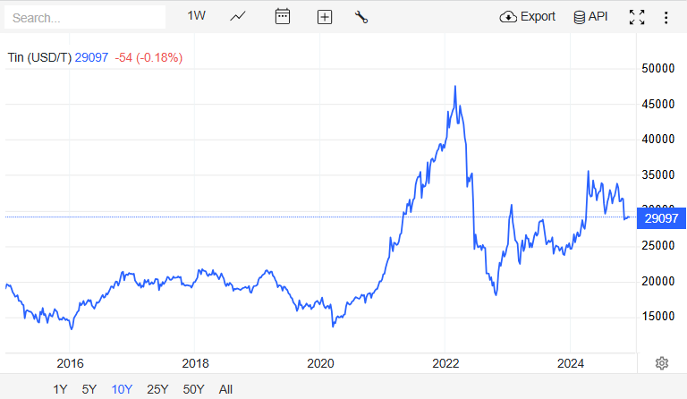The LT outlook for tin is extremely bullish given its crucial role in the future of digitization. Tin is technology’s ‘glue’, used as a solder to join together electronic components and semiconductors to circuit boards. While demand for semiconductors and soldering is temporarily weak, supply side issues remain unresolved. Over the last couple of years, tin demand has been growing at ~5%, while supply has been declining at roughly 5-10% due to major structural production disruptions in Myanmar and Indonesia. This has pushed the market into a yearly deficit of ~40Kt (~350Kt supply / ~390Kt demand).