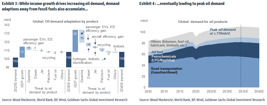 With the largest driver of onshore non-OPEC supply growth stalling out, the prospects of higher offshore exploration and production are quite bullish. If we assume conservatively that oil demand increases by 1% each year (or roughly 1mm b/d), we can see that US Shale will struggle to meet this demand. GS forecasts that oil demand will peak at 110mm b/d in 2035 and then plateau at 108mm b/d, 2040 onwards. Even after demand plateauing, significant new production (5.5 - 7.5mm b/d) will be needed to offset the natural 5-7% decline in production each year.