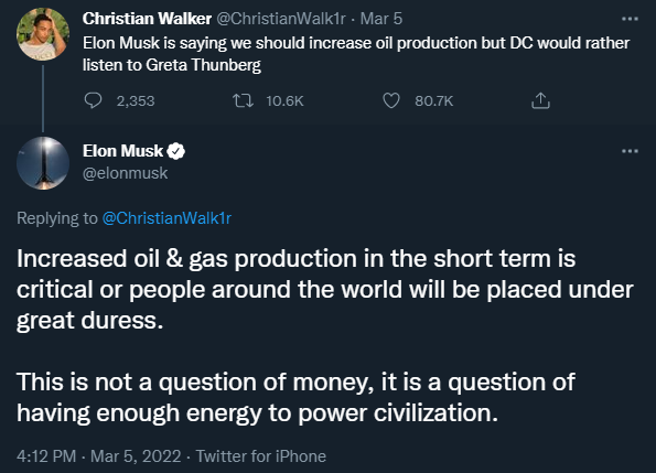 Secondly, I believe the West is in the process of finally understanding the importance of energy self sufficiency and developing a newfound respect for commodity markets. This is how commodity cycles typically work: years of overinvestment lead to excess supplies and low commodity prices which allow people to take commodity supplies for granted and leads to underinvestment. After years of underinvestment the process reverses: commodity prices rise as supplies become tight, and we go from a narrative of abundance to one of scarcity. It’s easier to talk about ESG and fossil fuel divestment when oil prices are at $30 / bbl vs. when oil prices are $100 /bbl. Even Elon Musk was recently forced to admit that our reliance on oil and gas is not something that can be turned off like the flick of a switch.