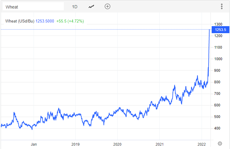 Lastly, I think this conflict is going to be very bad for food security. Russia and Ukraine are major exporters of essential food items including wheat and ammonia (used to make fertilizer). The recent sharp rise in food prices globally could lead to political instability in developing countries with fragile economies. Even if the situation de-escalates in the short term, Russia could weaponize ammonia and wheat exports in the future in exchange for sanctions removal. Rising fuel prices are also feeding into food inflation. For example natural gas is needed to produce ammonia and rising oil prices will impact the costs of mining for phosphate.