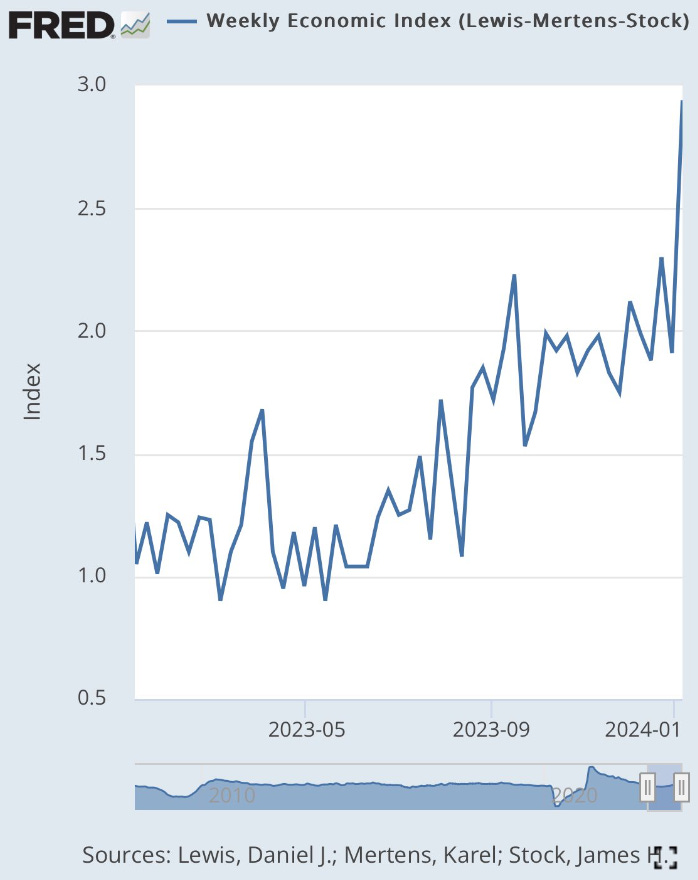 Looking at the latest economic data, there is little evidence that the economy is weak. It’s now clear that Q4 will be another strong quarter with GDPNow estimate firming up from 2.2% to 2.4% after this week’s strong retail sales print. High frequency data like JP Morgan’s Daily Consumer Tracker and the NY Fed’s Weekly Economic Index (WEI) are showing a strong bounce in spending and economic activity in January. The Michigan Consumer Sentiment Index rose to 78.8 on Friday, vs. expectations of 70.