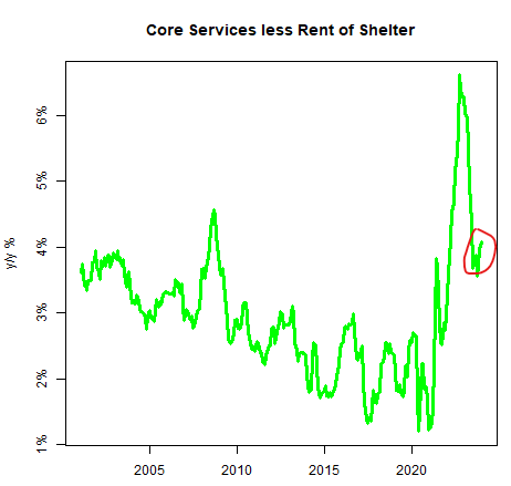What about inflation? Maybe a sharp drop in inflation can bring us to the promised land of 6+ rate cuts this year? I discussed inflation risks in my macro outlook piece, but they are worth a quick refresher. While goods disinflation has started in earnest and shelter will continue to drag inflation lower in the coming months, core service inflation ex-shelter (i.e. the stickiest form of inflation that occurs in labor-intensive sectors) is showing some early signs of bucking the trend. This shouldn’t come as a surprise if you’ve been following the labor market.