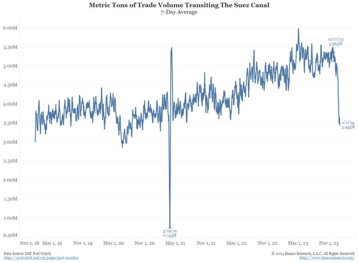 Goods disinflation may also be at risk due to recent supply chain issues. Two of the world’s largest shipping choke points (Suez Canal and Panama Canal) are continuing to operate at only half their capacity. You can argue these are ‘transitory’ factors, but anyone who’s been trying to forecast inflation over the past two years should approach this issue with a bit of humility.