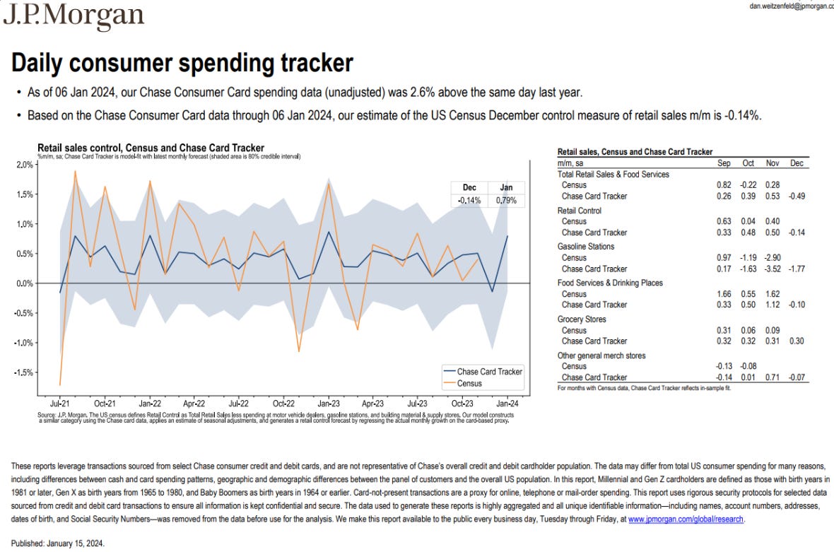 What does all of this mean for investors and traders? I think it means that one shouldn’t expect interest rates to be cut aggressively unless: 1/ the economy weakens significantly and/or 2/ inflation continues coming down rapidly. Which in turn means that the markets remain fragile. In response to Waller’s speech, the front-end of the bond curve had one of its worst weeks in recent memory and the 10Y bond has given up more than half its gains since the December 13th ‘pivot’. The Russell 2000 has fallen ~6% from its late December high. The SPX and QQQ have bucked the trend, but positioning is starting to look stretched, especially in light of the strong performance over 2023. Tech equity funds saw their biggest two-week inflow since August at $4 billion, as per BofA data. A bearish macro catalyst could have an outsized impact on the downside.