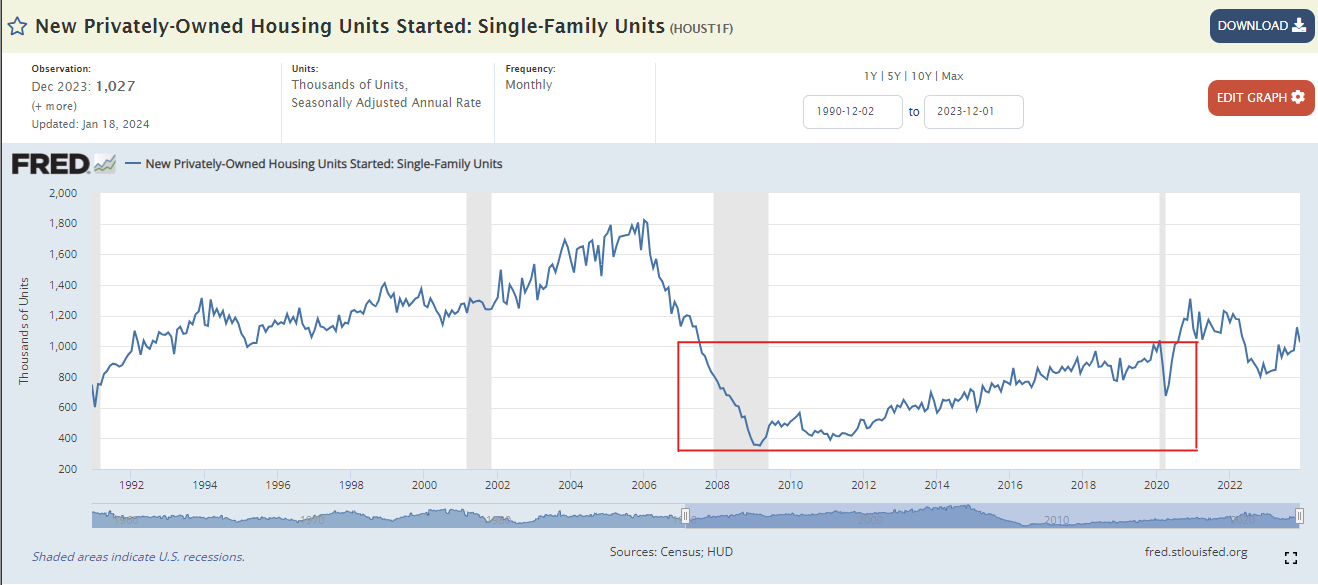 The post-GFC period witnessed significantly lower than average housing starts for several years (see chart below).