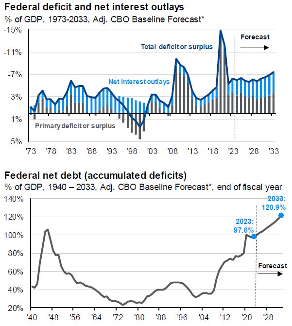 It’s hard to explain how the economy has continued to be this resilient for this long. If I had to guess, I would say that market participants and economists have severely underestimated the impact of fiscal spending and overestimated the transmission rate for interest rate hikes. Very few investors have seen a rate hike cycle combined with fiscal spending of this magnitude, and therefore it has been hard for all of us to calibrate our minds and economic models to account for these factors accurately. Perhaps it’s impossible to get a recession when the government is running a deficit that’s 7-8% of GDP (which previously would be unheard of, outside of recessionary periods). And perhaps the current level of real rates is sustainable indefinitely because the r-star (natural rate of interest) has shifted higher.