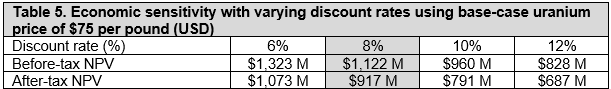 The margin of safety in GLO stock is clear from the latest NPVs in the revised feasibility study (FS) published just a few weeks ago. At US$75 / lb uranium price and a 12% discount rate, the Phase 1 after-tax NPV is US$687mm / ~C$930mm, relative to GLO’s current market cap of ~C$480mm. The consultants have taken a very conservative approach with the latest iteration of the FS, baking in ~US$230mm of contingency costs.
