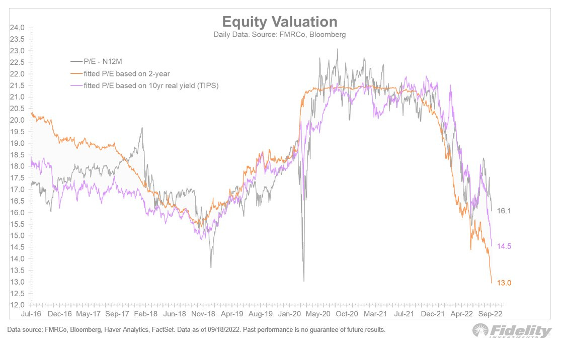 Looking forward, there is a high probability of the market continuing to make lower lows until the Fed changes its stance and bond yields stop rising. The chart below from Fidelity indicates that the fair value of the SPX based on the current 2-year and 10-year treasury yield is 13 - 14.5x P/E. Applying this ratio to 2023 EPS estimate of $234 (Goldman Sachs) would imply an SPX value between ~3050 - 3400, or 8 - 17% lower from here (assuming the EPS estimate is accurate). In a recessionary scenario we can expect EPS to be significantly lower, a risk that I believe is not currently reflected in analyst forecasts.