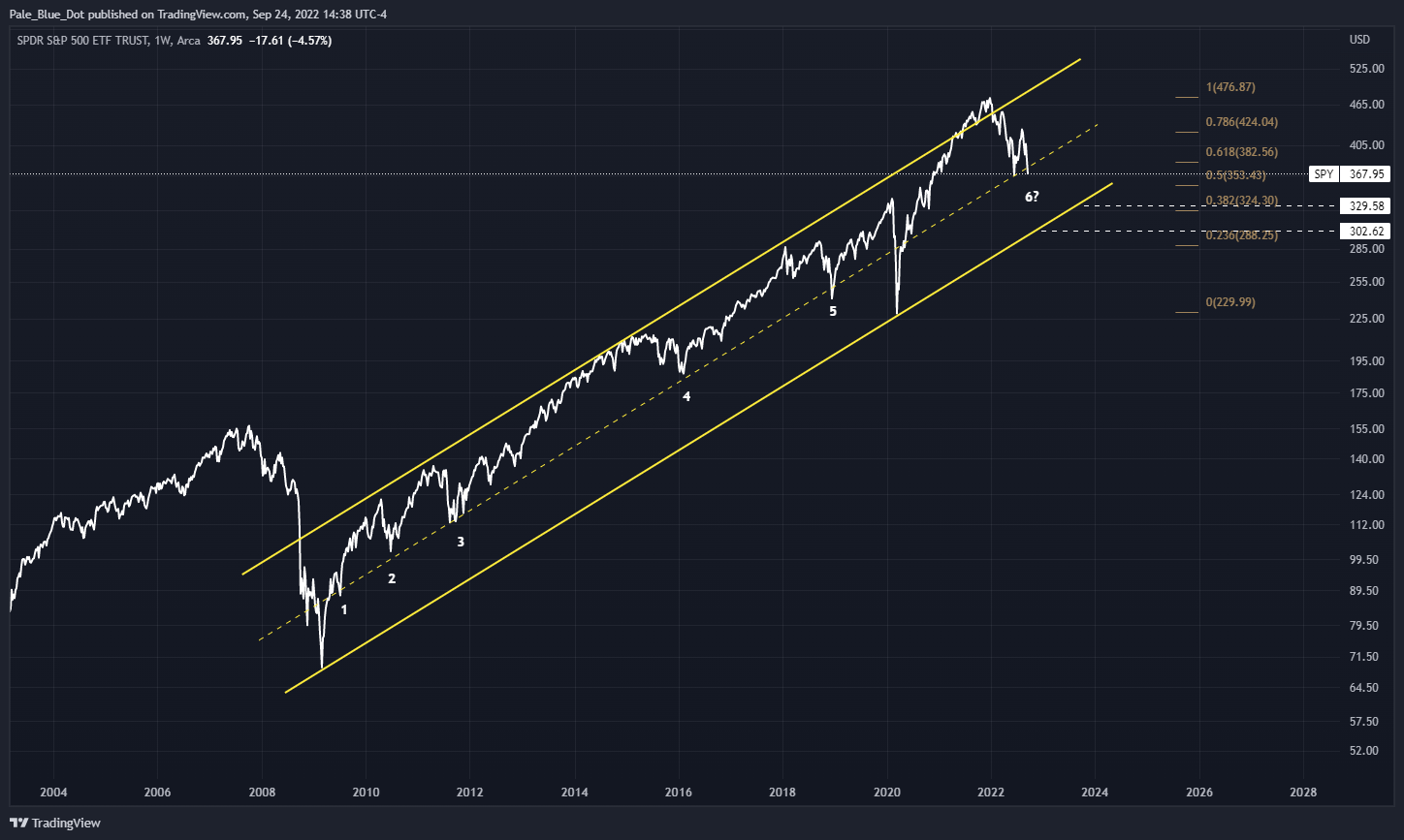 From a technical point of view the SPY is breaking below the mid-point of the uptrend channel (dotted line) that started after the GFC in 2009 (click on the chart to magnify). This mid-point has acted as support for the market numerous times over the past decade and a break could signify that the bottom of the channel (somewhere in the 3000 - 3300 range) might be tested. This would fit nicely with the valuation analysis from above.