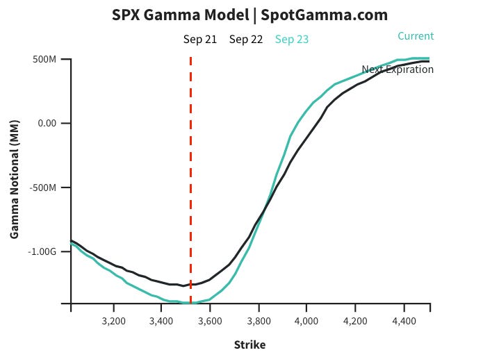 We are also in deeply negative gamma territory which could exacerbate a downward move (if you don’t know what this means, please read my primer on option-related dealer hedging flows and their impact on the market here and here). Spot Gamma’s model shows that below the 3600 area selling pressure from dealer hedging will start to ease but this could change if the demand for OTM put options increases.