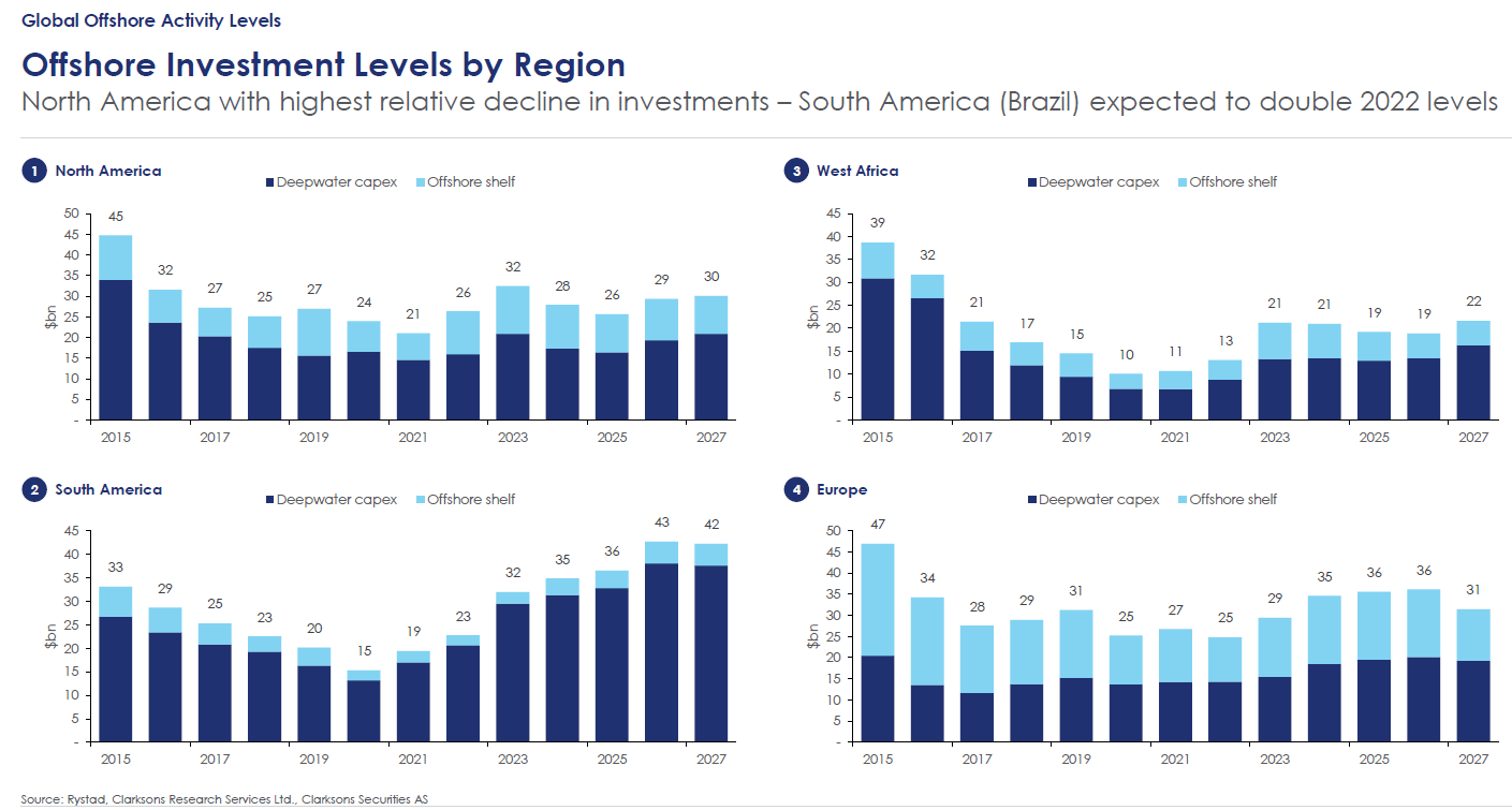 Energy consultant Ryastad is expecting a 20% increase in offshore spending in 2026 and 2027 vs. the annual amount between 2023 and 2025. The chart below from Clarksons illustrates ~$10bn increase in offshore capex expected in 2026 (vs. 2025) in the Americas. Petrobras recently lowered its capex guide but noted that it’s very focused on replacing reserves and stemming production declines post 2030. The company also noted that 100% of its capex budget is resilient at $45/bbl. West Africa remains a hot market for drill ships with Galp’s Mopane discovery and other exploration prospects being pursued in Namibia. Guyana and Gulf of Mexico also present opportunities. Evercore ISI analyst, James West, recently wrote the following in a note to investors: