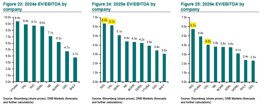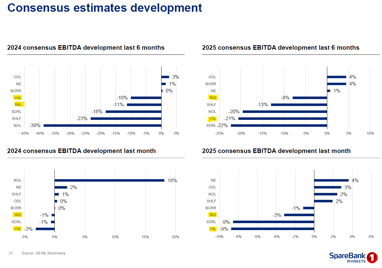 I’m quite confident that the world will need significantly more offshore oil in the coming years, but at present, the market is not willing to look beyond what seems to me like a temporary / cyclical slowdown in the market. Almost every new piece of information is interpreted as bearish, especially in the case of RIG. While this price action and timing uncertainty may put off some investors, it’s also what creates the opportunity. If you’re willing to look beyond the next month, or the next quarter, and take a 2+ year view, the offshore sector is quite attractively valued at the moment. For example, RIG and VAL are trading at ~6x 2025E EBITDA and 6x and 4x 2026E EBITDA, respectively, based on analyst EBITDA estimates that are arguably conservative as they suffer from recency bias (see estimate revisions chart below).