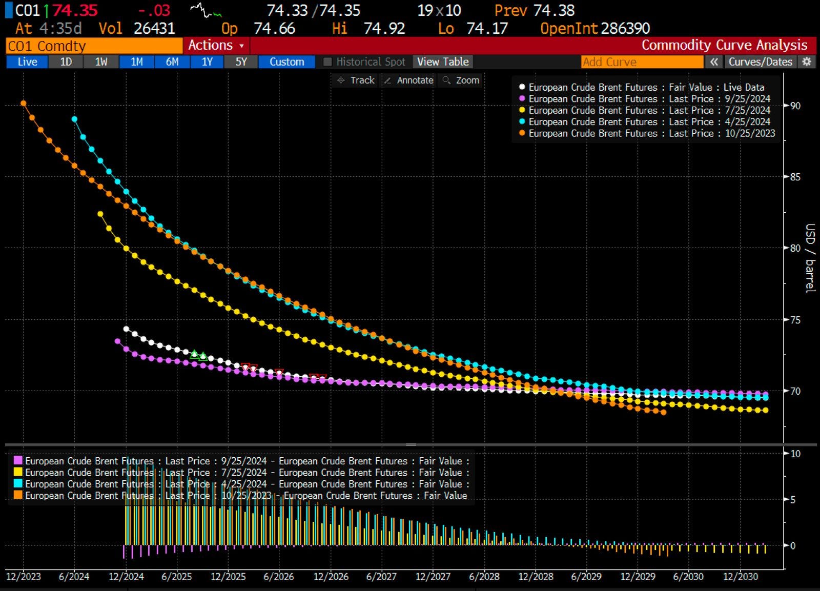 Some skeptics have stated that the recent decline in oil prices spells a death knell for the offshore thesis, but I believe this is a misunderstanding of the long-cycle nature of offshore oil projects and breakeven prices. Offshore projects require 4-8 years to develop, and cost north of $5bn+. Any E&P looking into offshore seriously is not going to base their decision on volatile front-month oil price movements. Instead, offshore FIDs are more dependent on 2027+ prices, which have been resilient in the high-60s to low-70s (see chart below which illustrates the Brent futures curve at different points in time). Based on the current cost curve (see slide above from Valaris investor presentation), ~85% of undeveloped offshore reserves are estimated to be profitable at the current long-end oil price curve.