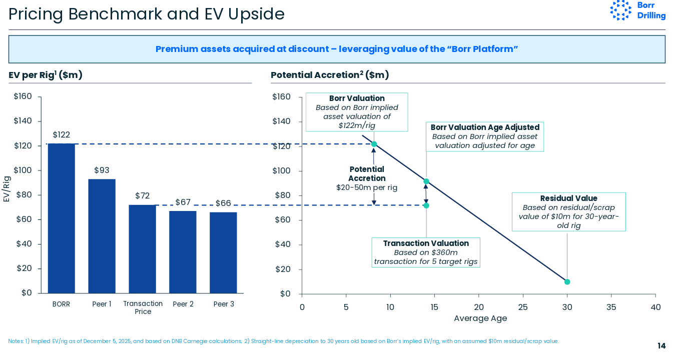 BORR has seen a strong rally since I decided to add it back to the portfolio in early December. Soon after my write up, BORR announced that it had acquired five jackups, three JU-3000Ns and two CJ-50s, from Noble Energy for $360mm. The implied transaction values are ~$77mm per JU-3000 and ~$64mm per CJ-50. In contrast, Seadrill sold three JU-3000Ns for $113mm per rig in July 2024, suggesting BORR got a good deal. In the chart below BORR has extrapolated a fair value of the rigs to be $20-$50mm higher than the purchase price, based on the market implied valuation of BORR’s pre-acquisition fleet.