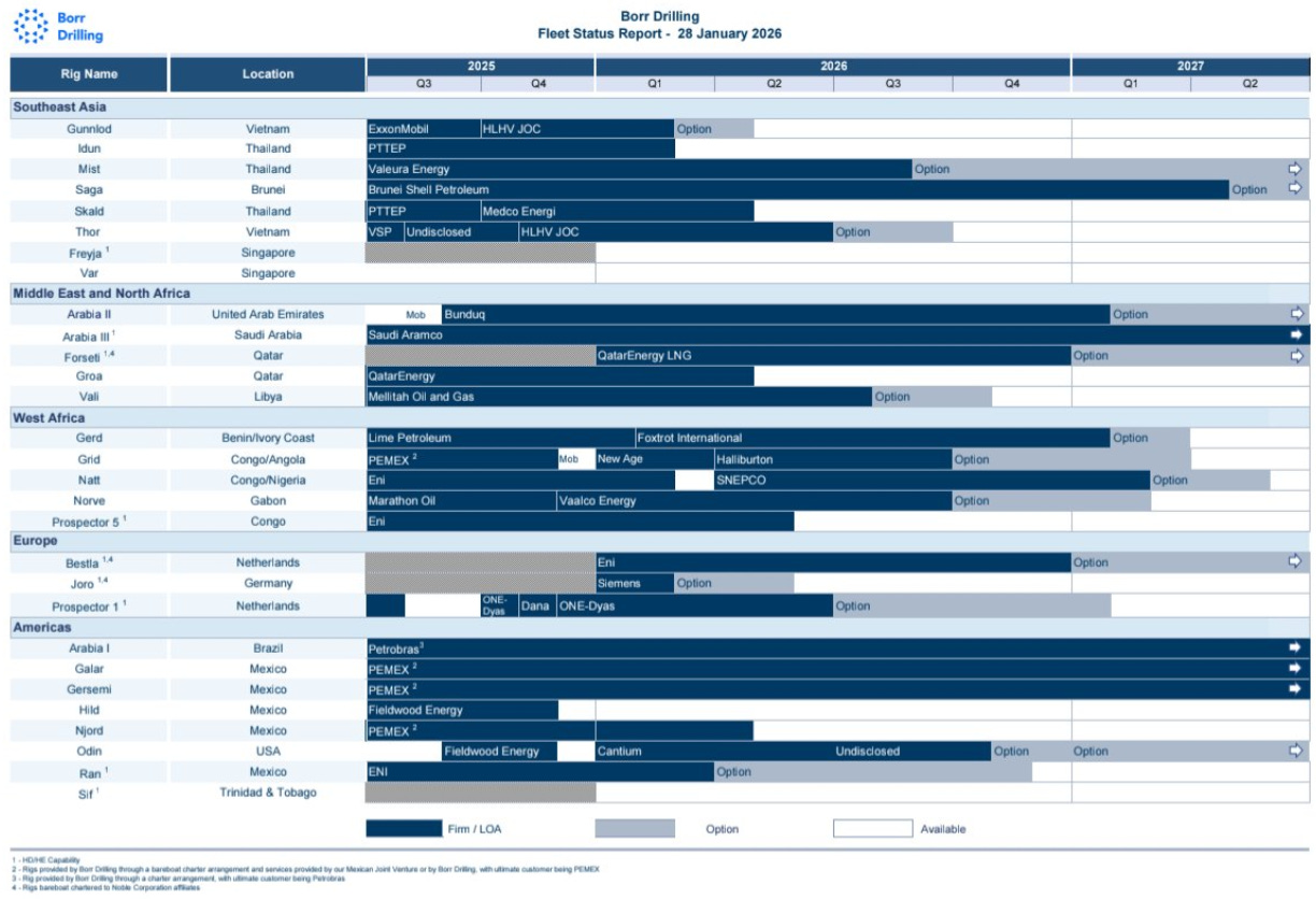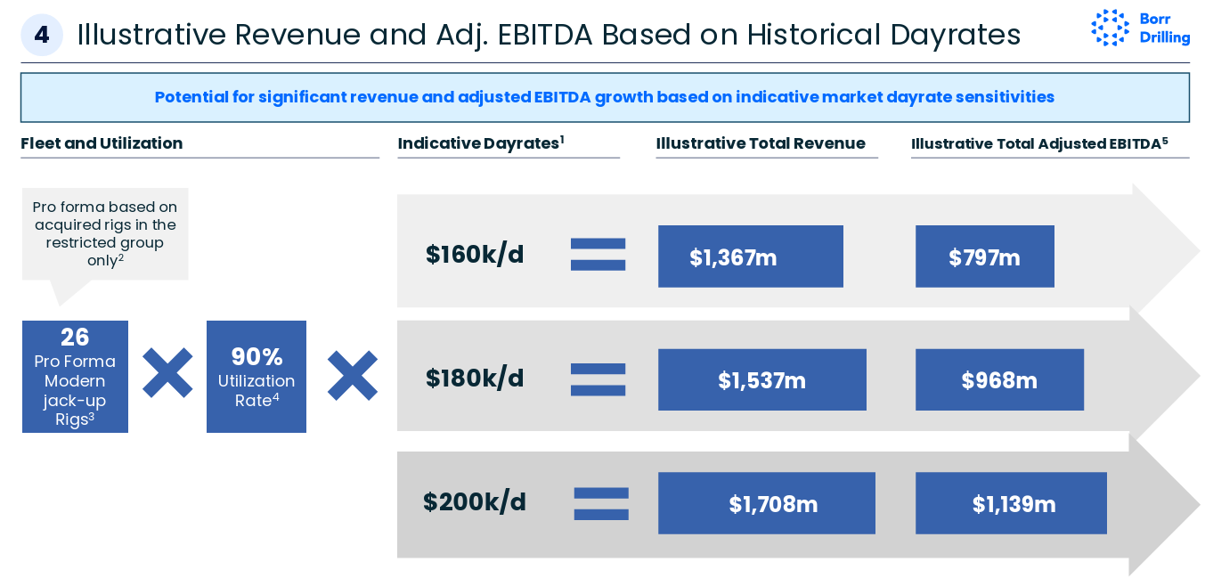 As part of the transaction, Noble will receive a $150mm, 6-year note from BORR secured by three JU-3000N. BORR also issued $85mm in equity to support liquidity. The company is projecting $800mm - $1bn in EBITDA from 26 jackups in the ‘restricted group’ (for credit purposes) at a dayrate range of $160-180K/d.