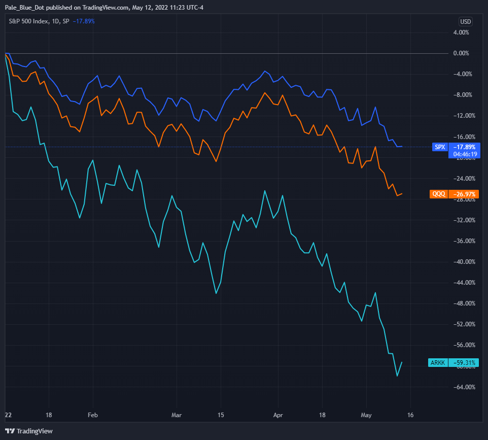 Since then ARKK is down roughly 30%, QQQ down ~10% and the SPX down 5.5%. YTD performance as of this writing is -59%, -27% and -18% respectively. These numbers don’t fully reflect the pain retail investors and hedge funds are suffering as a number of individual technology names have lost more than two-thirds of their market value in recent months. Investors are recognizing that many of these stocks have been propped up by false narratives around growth, competitive advantage and the illusion of long term profitability. I discussed this recently and continue to believe that there is more pain ahead as the equity value of many of such companies will eventually prove to be worth zero, or close to zero.