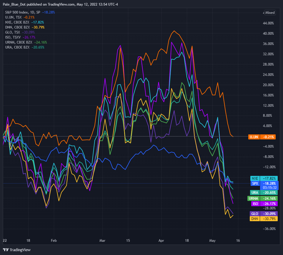 So far this year that strategy has worked with the physical trust (ticker: U.UN) outperforming both the SPX as well as the miners which are down 20-30%. I think holding an overweight position in U.UN continues to make sense given my bearish views on the market and the uranium miners continuing to exhibit high beta characteristics. If we did get a market crash or some kind of capitulation move I’ll look to rotate into the miners and add more to URA call options.